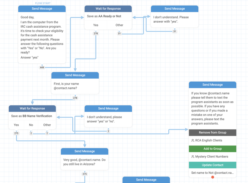 LaNaya’s team built this flow to send to clients each month. It confirms their identity and updates their income and work status. The flow also verifies their location and address, adjusting their contact group accordingly. Messaging flow may also provide important program updates to help clients stay eligible.